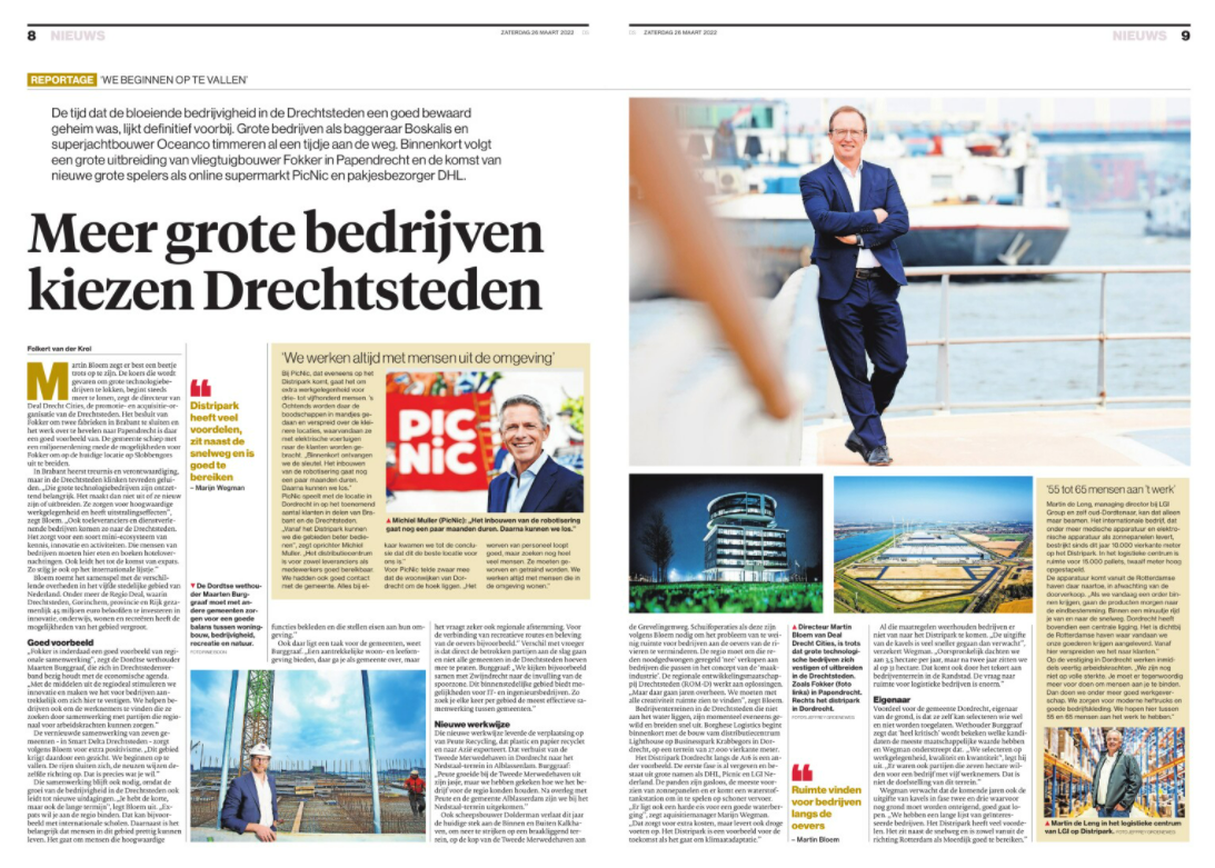 De tijd dat de bloeiende bedrijvigheid in de regio Drechtsteden een goed bewaard geheim was, lijkt volgens het Algemeen Dagblad definitief voorbij. Bedrijven als Boskalis en Oceanco timmeren al een tijdje aan de weg in onze regio. En de komst van nieuwe grote spelers, als online supermarkt Picnic en pakjesbezorger DHL volgt binnenkort. Het einde lijkt bovendien nog lang niet in zicht.